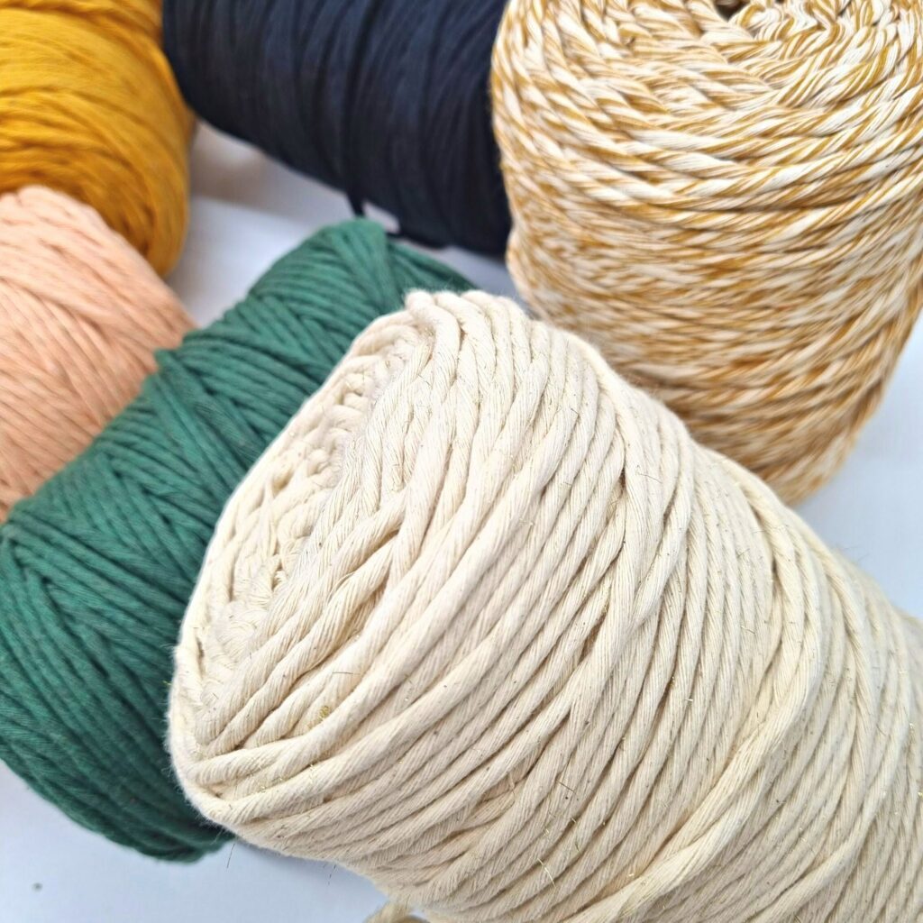 Beim gezwirnten Makramée Garn werden mehrere Einzelfäden durch Drehung zu einem dickeren Seil verbunden.