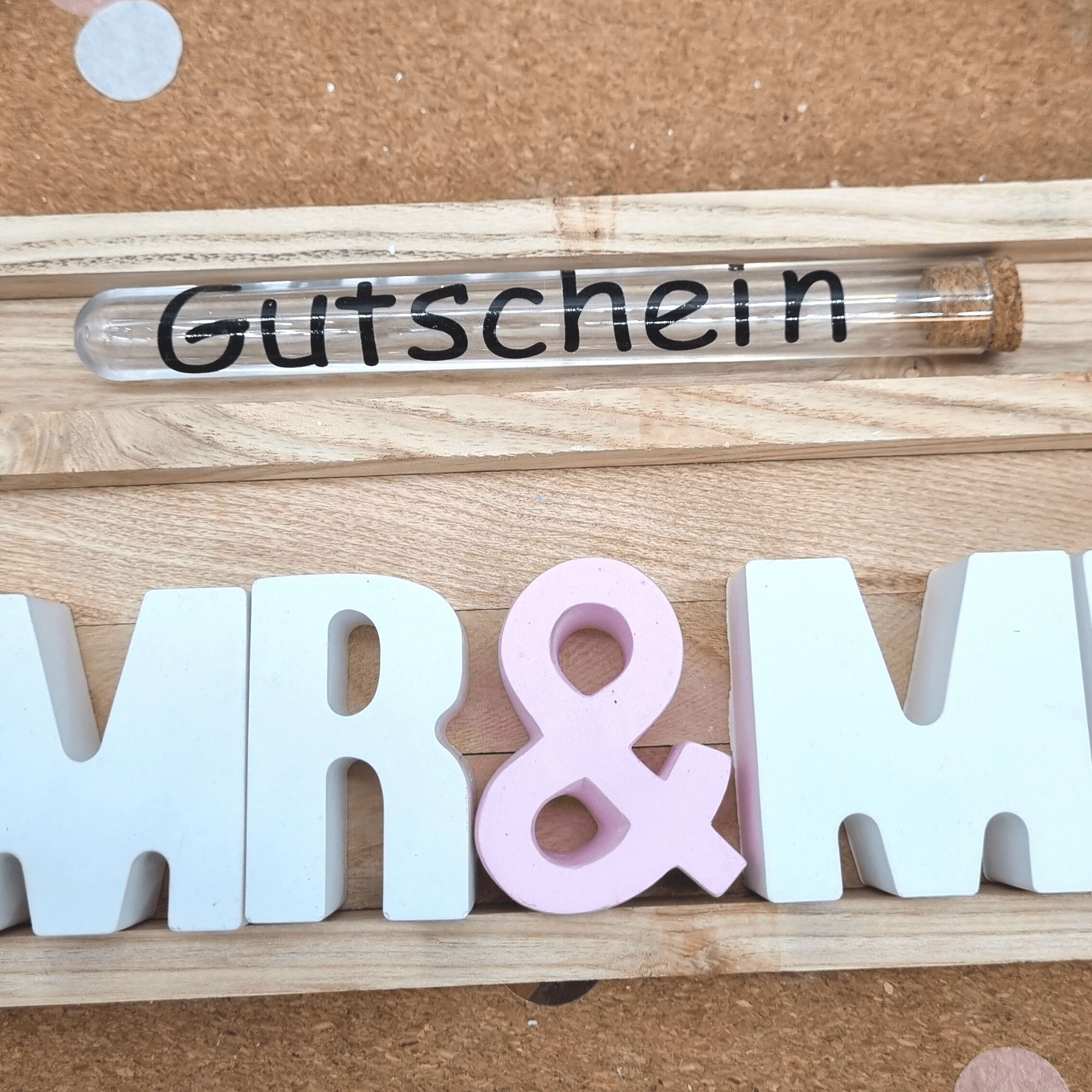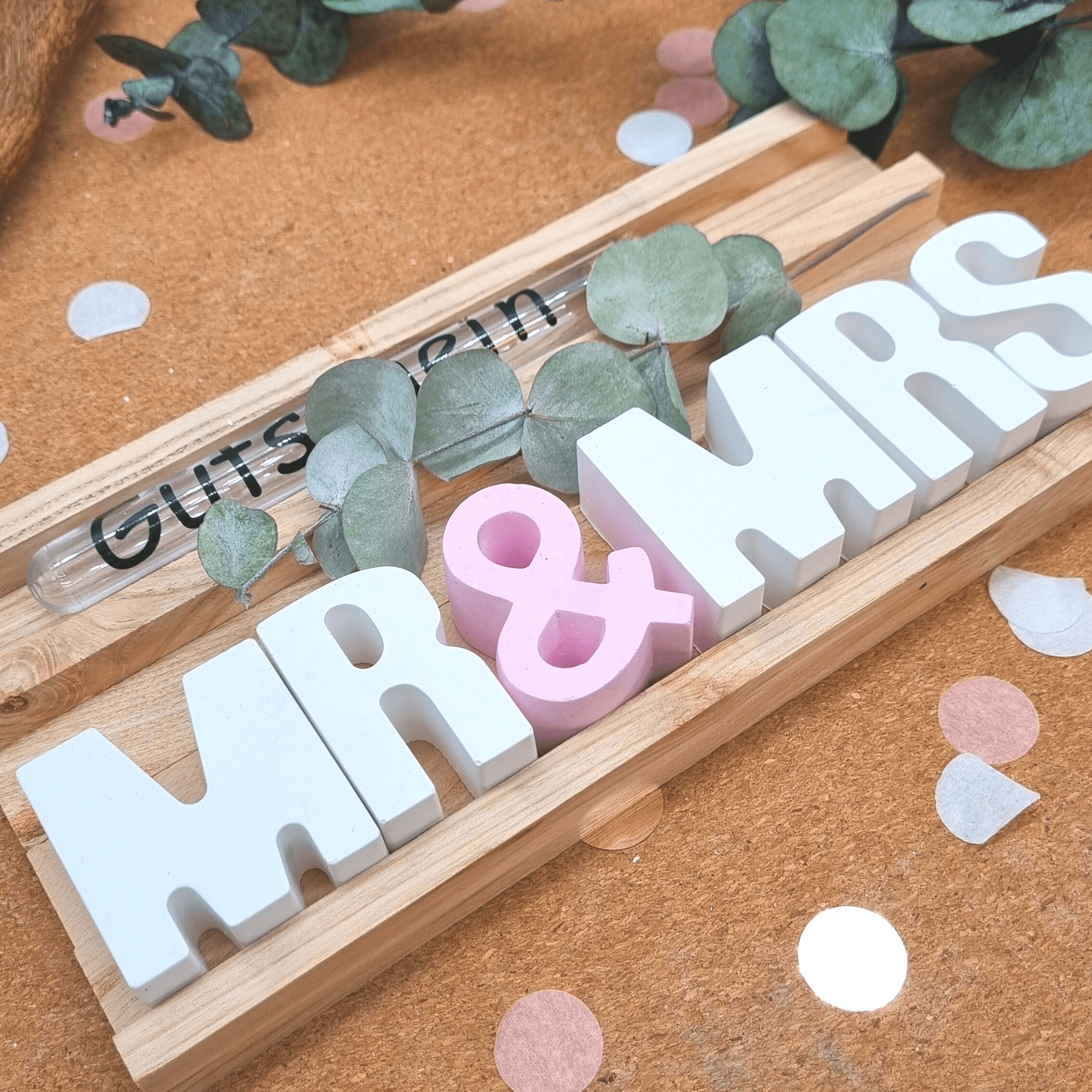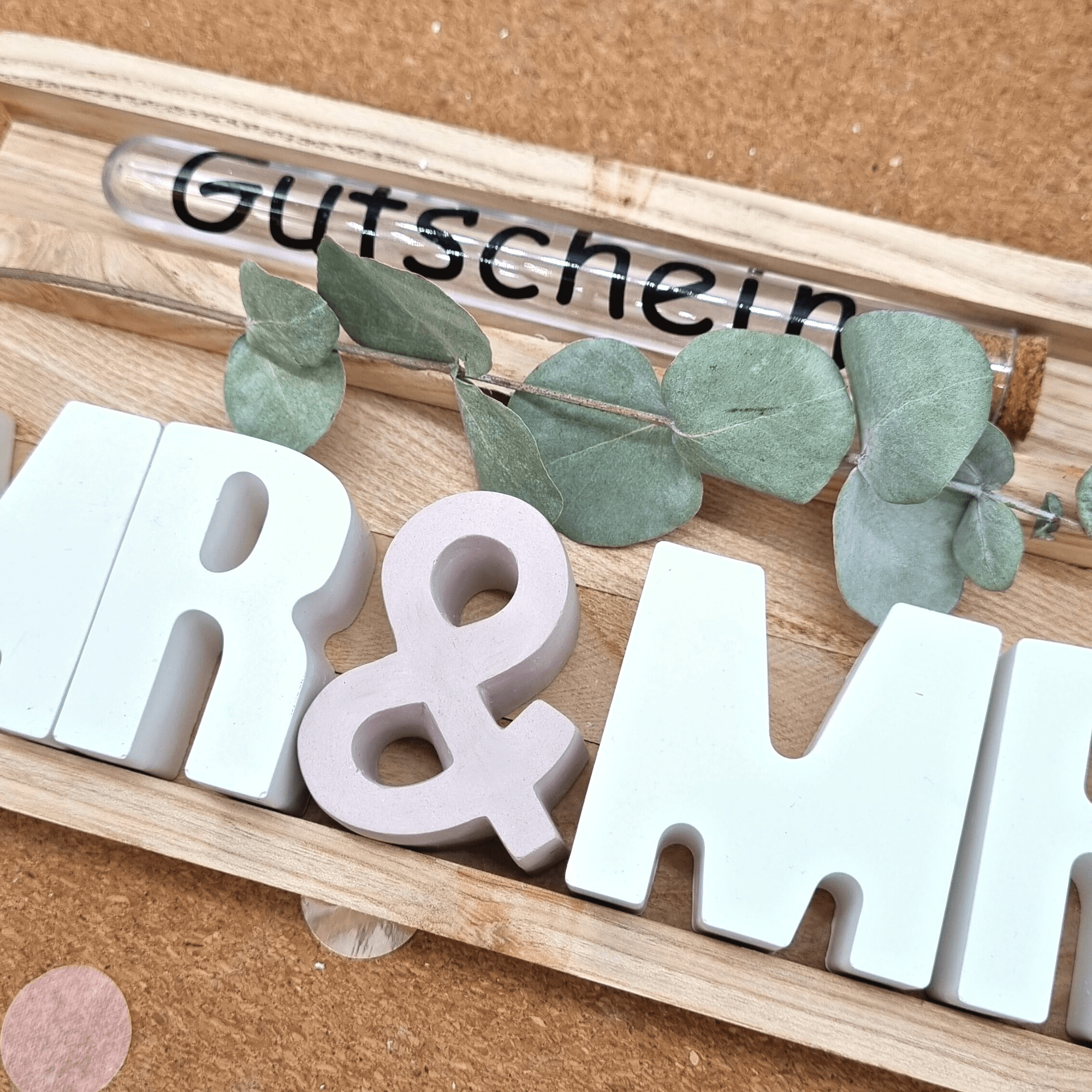 Der Preis gilt für das Set Mr & Mrs in deiner Wunschfarbe inklusive Holzbox und Reagenzglas mit Aufschrift. Die Buchstaben sind je 5 cm hoch und ca 2 cm tief.