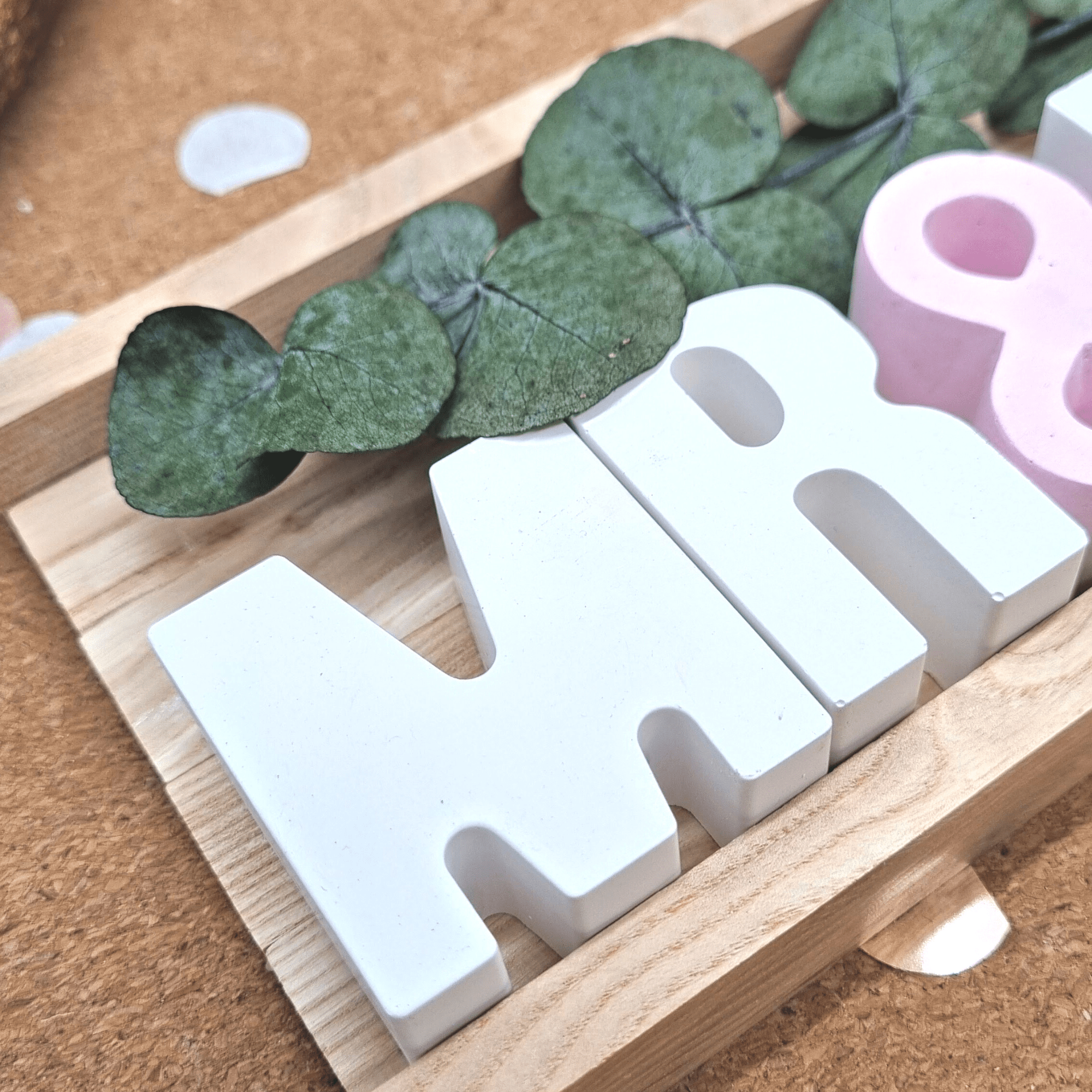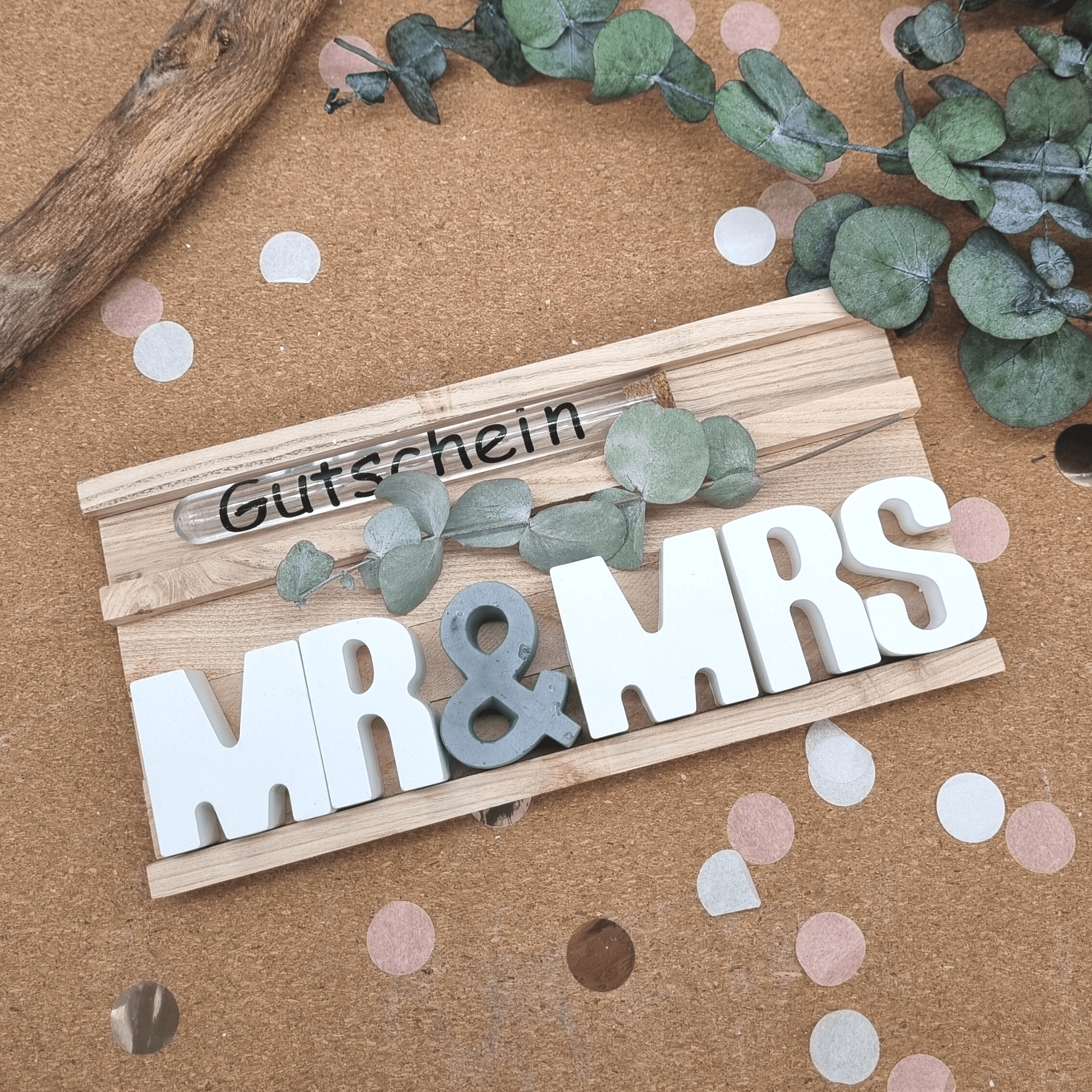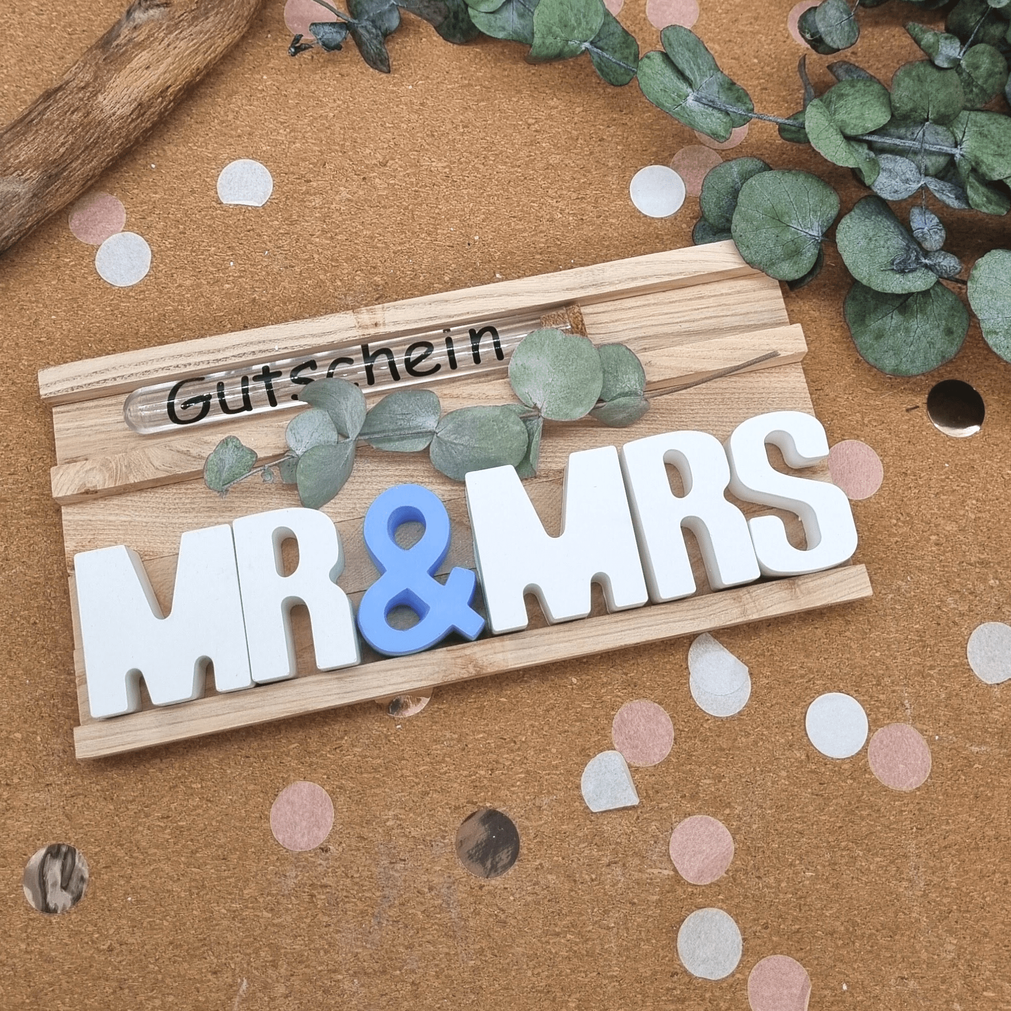 Der Preis gilt für das Set Mr & Mrs in deiner Wunschfarbe inklusive Holzbox und Reagenzglas mit Aufschrift. Die Buchstaben sind je 5 cm hoch und ca 2 cm tief.