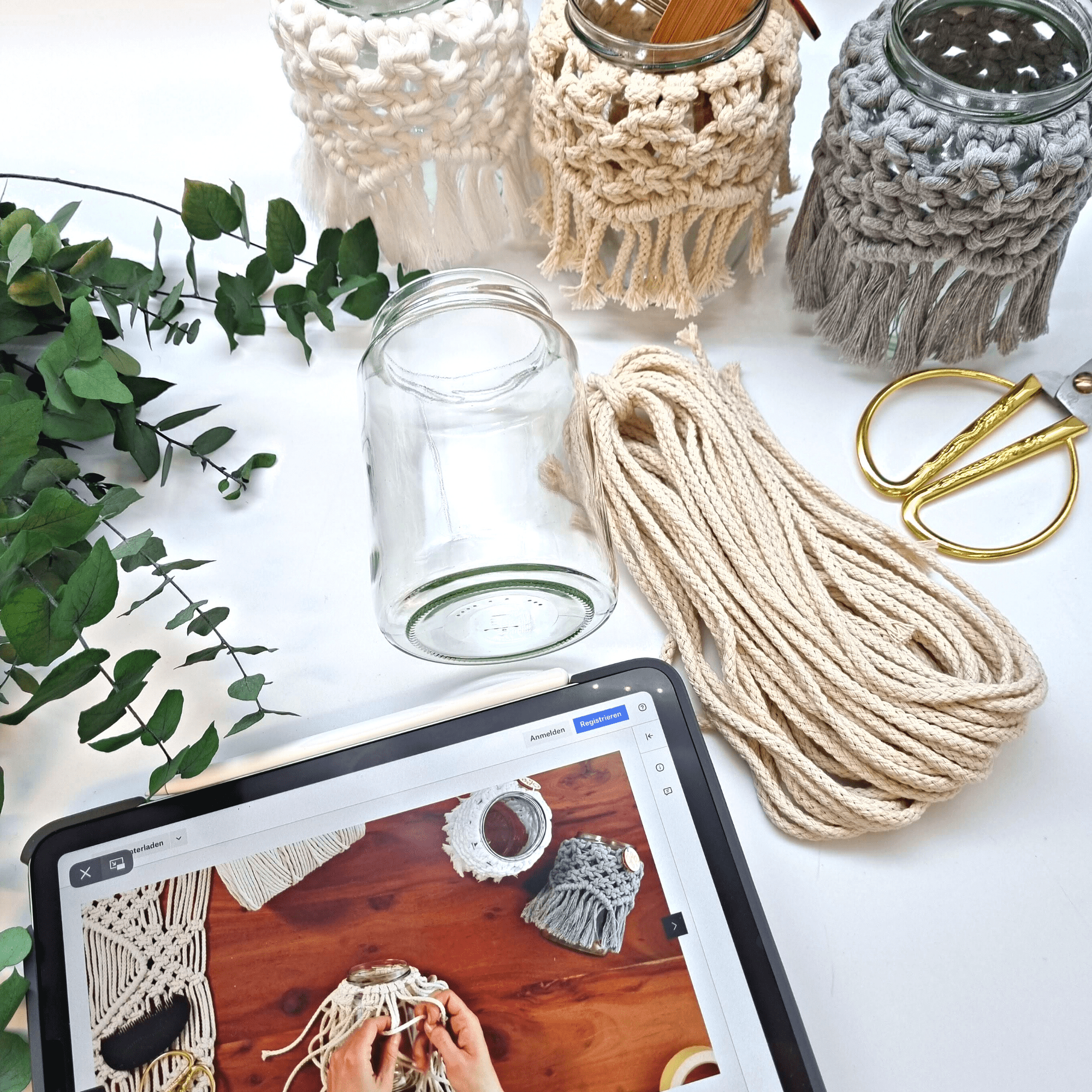 Das Makramee DIY Set Windlicht ist ein komplett Set inklusive Material, Videoanleitung und Schritt-für-Schritt PDF Anleitung.