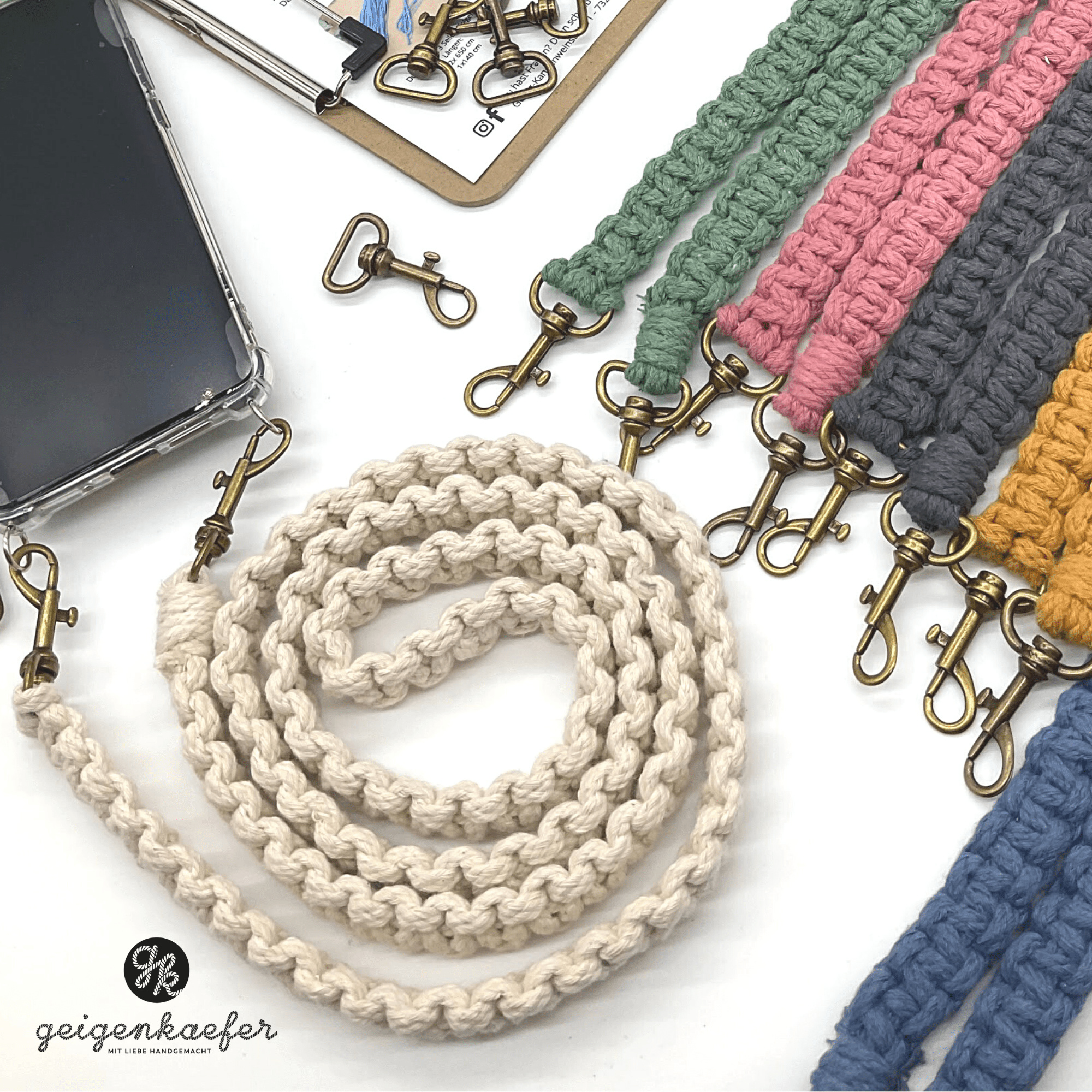 Handyketten liegen aktuell voll im Trend und sind darüber hinaus auch noch super praktisch. Als Makraméeband in trendigen Farben sind sie der Hingucker.