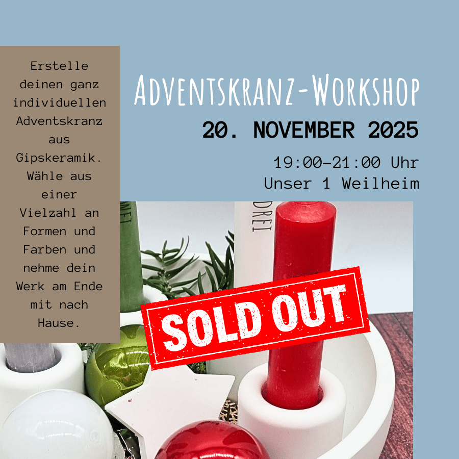 Hinweis: Die gegossenen Adventskränze können nach dem Workshop direkt mit nach Hause genommen werden. Bringe dafür einen Karton oder einen Korb mit.