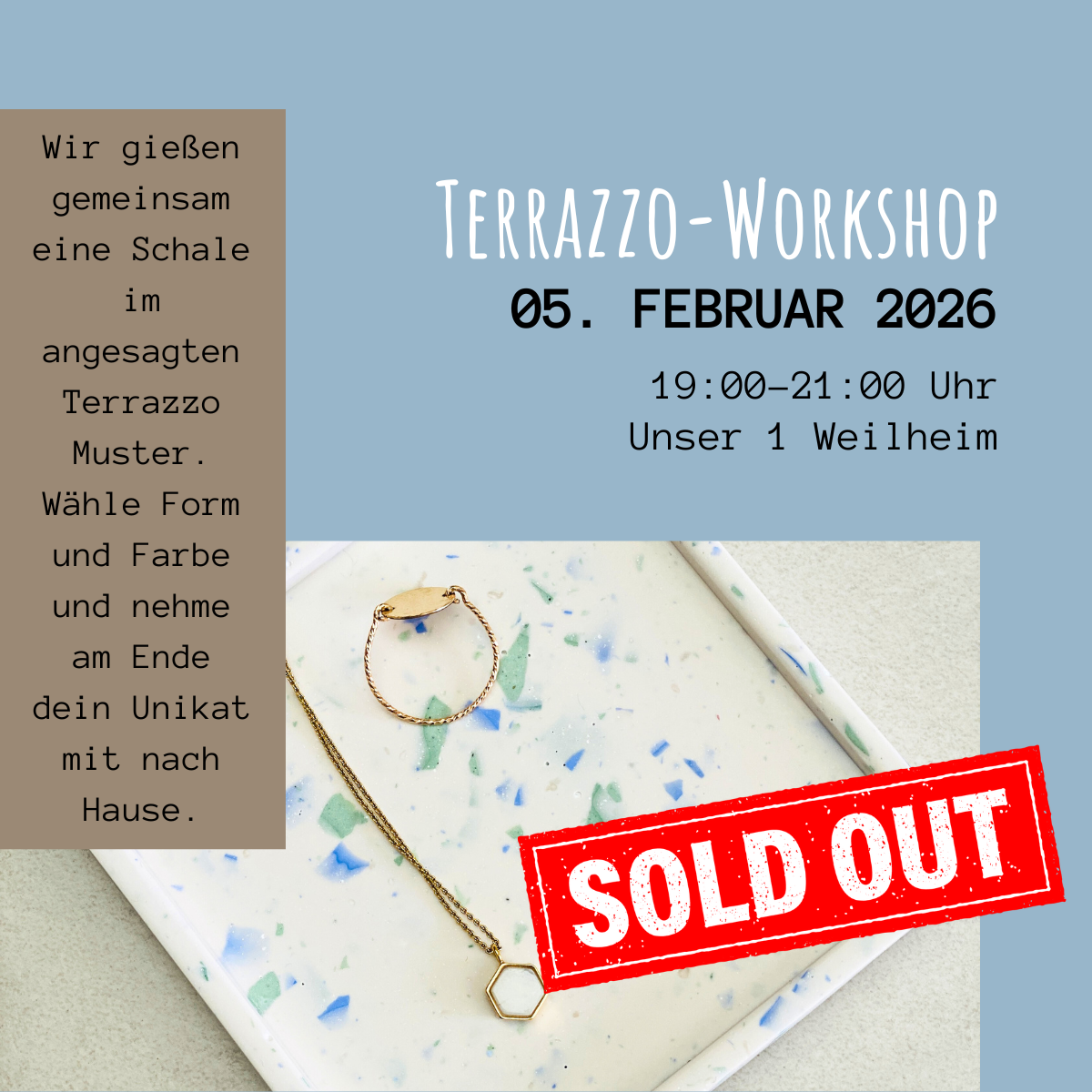 In diesem Workshop tauchst du ein in die farbenfrohe Welt des Terrazzo-Designs! Gemeinsam gestalten wir stylische Unikate aus Gips, bei denen du deine eigene Farbkombination und Musterung selbst bestimmen kannst.