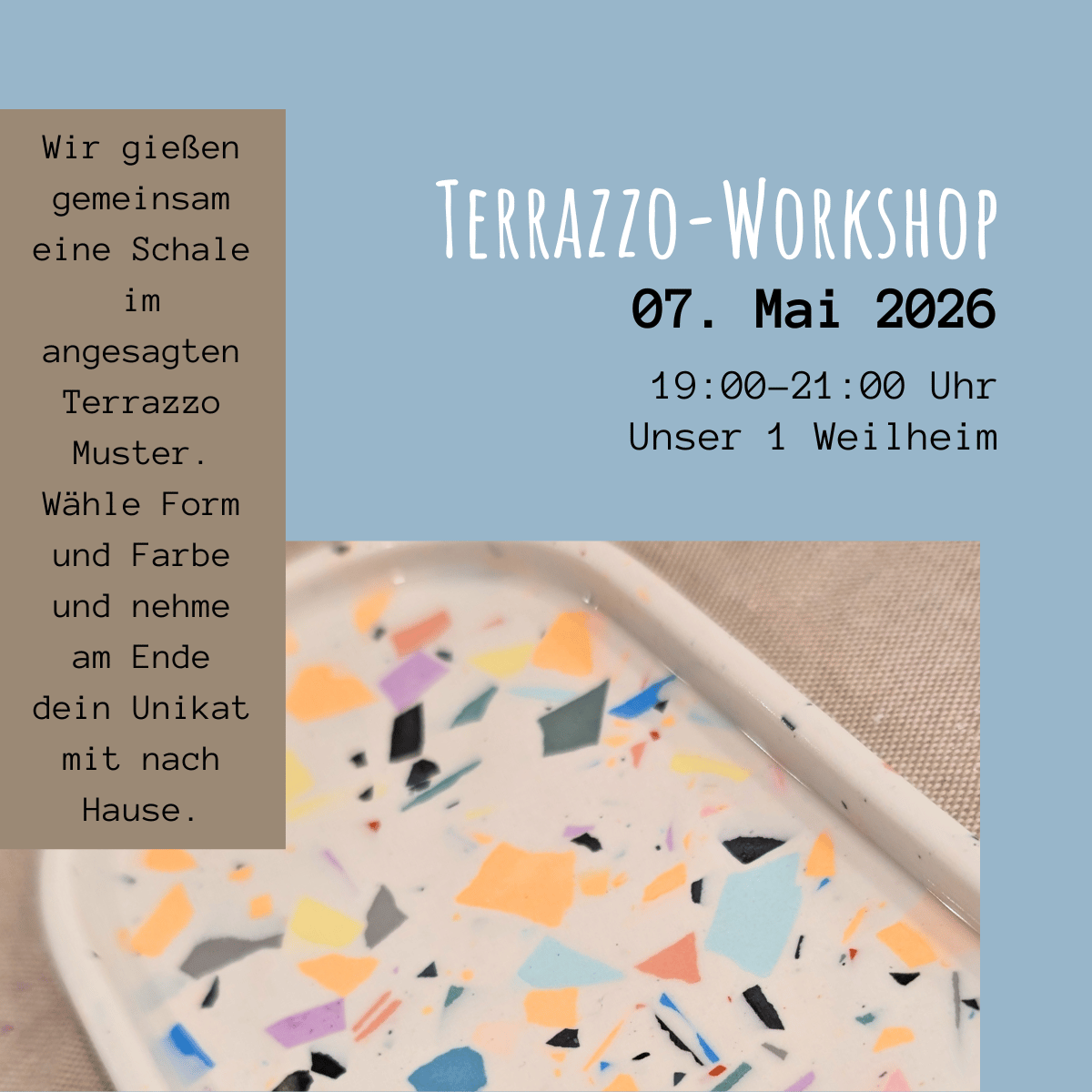 In diesem Workshop tauchst du ein in die farbenfrohe Welt des Terrazzo-Designs! Gemeinsam gestalten wir stylische Unikate aus Gips, bei denen du deine eigene Farbkombination und Musterung selbst bestimmen kannst.